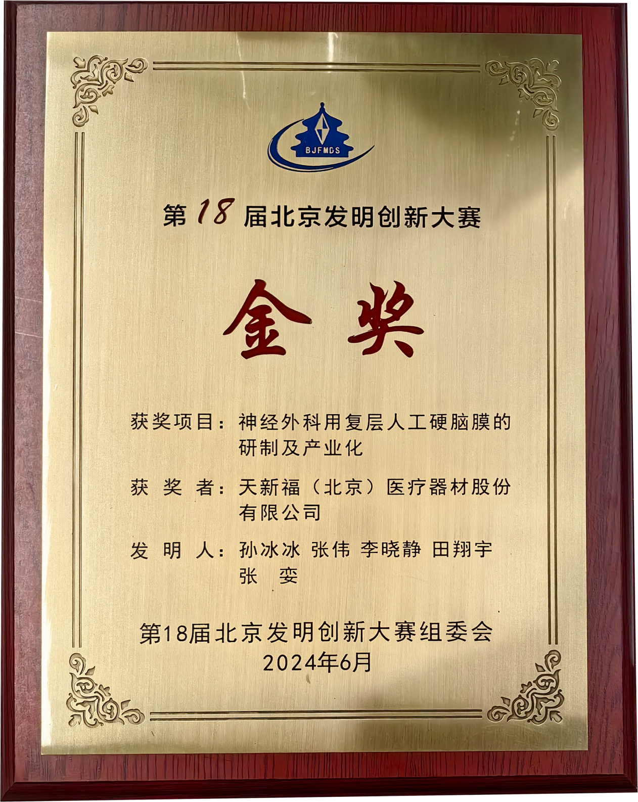 近日,由北京發(fā)明協(xié)會主辦的第18屆北京發(fā)明創(chuàng)新大賽頒獎會在湖北大廈召開,天新福(北京)醫(yī)療器材股份有限公司申報的《神經(jīng)外科用復(fù)層人工硬腦膜的研制及產(chǎn)業(yè)化》項目榮獲“第18屆北京發(fā)明創(chuàng)新大賽金獎”。